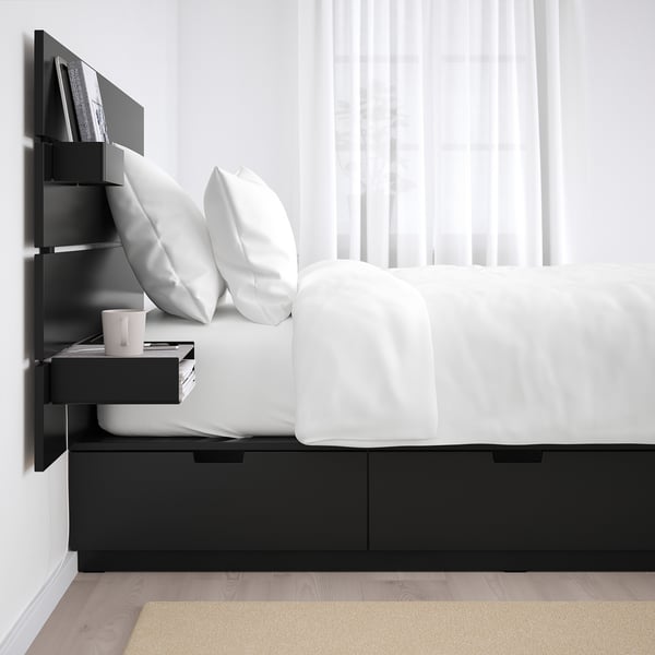 Full, Queen and King beds NORDLI Bed with headboard and storage There's plenty of space in the drawers for clothes, extra duvets and sweet dreams - and you can position the headboard's box and shelf so your favorite book is easy to reach.